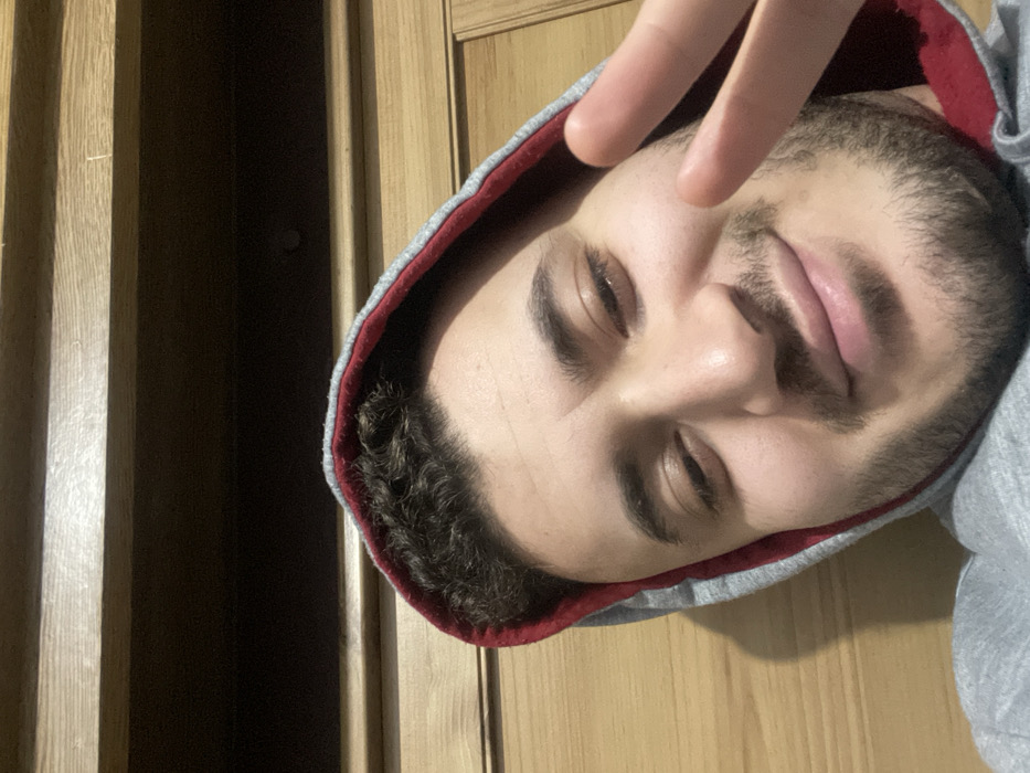 A person with dark hair and a beard, wearing a gray hoodie with a red lining, poses close to the camera. They hold up two fingers in a peace sign near their face. The person's eyes are partially closed. The background is a wooden surface, with a section showing a dark, door-like feature. The image is rotated, appearing sideways.