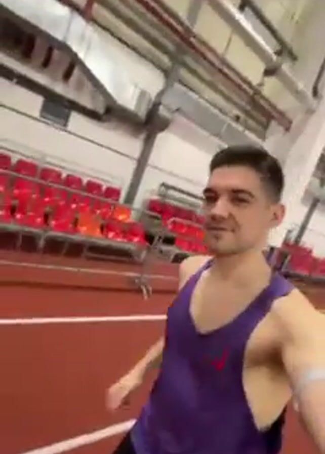 A man wearing a purple tank top is running on an indoor track. He looks at the camera and gives a peace sign. The track is red with white lines. There are red seats in the background. The building has a white ceiling with exposed pipes and vents. Another person is visible running in the background.