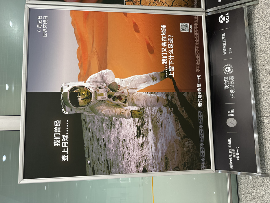 An indoor photograph depicts a prominent vertical poster display situated within Beijing Capital International Airport in Shunyi District, China. The poster, framed in silver, features a central image of an astronaut in a white space suit. The background is vertically split: the left displays a dark, cratered lunar surface under a black sky, while the right shows rolling orange sand dunes under a lighter orange sky, resembling a desert or Martian landscape. The astronaut's helmet visor reflects a golden hue, showing indistinct white forms. Chinese text overlays the image. The top left reads '我们曾经 登上月球......' (We once landed on the moon......), and the top right indicates '6月五日 世界环境日' (June 5th World Environment Day). To the bottom right, adjacent to the astronaut's right leg, it states '......我们又会在地球 上留下什么足迹?' (......what footprint will we leave on Earth?). Centered below the astronaut, the text '我们是#恢复一代' (We are #GenerationRestoration) is visible, with a QR code and '加入我们' (Join us) at the bottom right. A black horizontal panel beneath the main poster displays additional white Chinese text and logos. On the left, it reads '我们的土地,我们的未来。 我们是 #恢复一代' (Our land, our future. We are #GenerationRestoration). The center section features logos for '世界环境日' (World Environment Day) and '联合国 环境规划署' (United Nations Environment Programme - UNEP) with their respective symbols. The right side shows '沙特阿拉伯王国 2024' (Kingdom of Saudi Arabia 2024) and 'BCIA'. The poster is positioned on a stand, casting shadows, with a light-colored, reflective floor in the foreground. Reflections of overhead lighting are visible on the floor and on a glass partition to the left. A portion of another poster showing cracked, dry earth is visible on the right. No individuals are depicted in the immediate vicinity or interacting with the display.