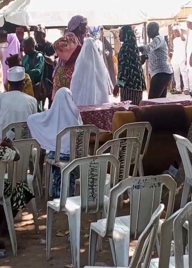 gathering of people, likely at an event outdoors. Many are dressed in traditional clothing, including head coverings. The environment appears to be a courtyard or open space, with a large white tent providing shade. Plastic chairs are arranged in rows, some occupied by people sitting and watching. Several people are standing, some seemingly posing for photos or being filmed. The atmosphere seems festive and social, possibly a wedding or celebration.