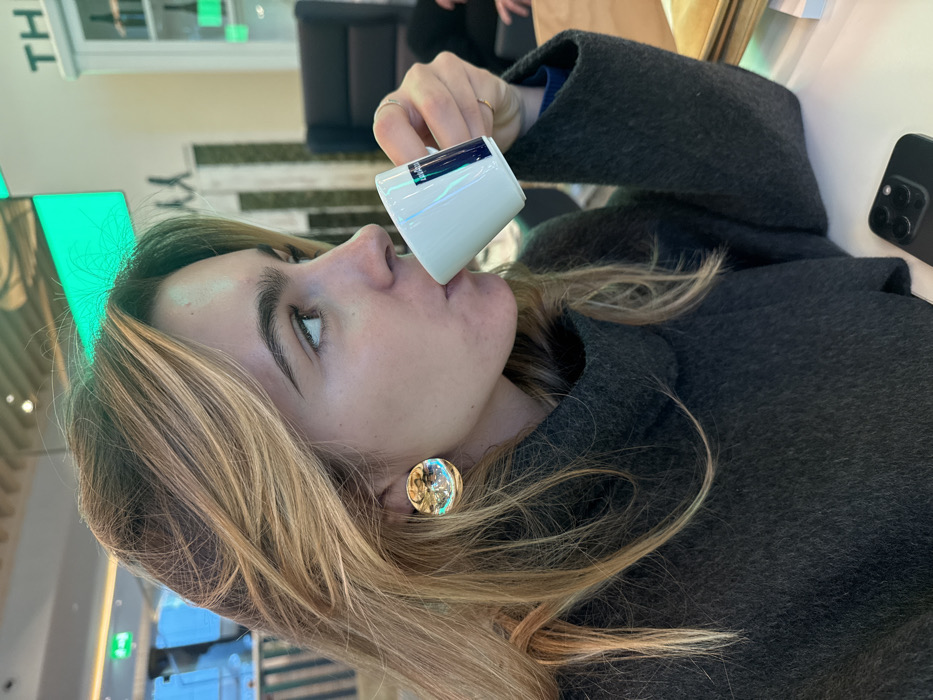 A female subject, appearing to be in her 20s-30s with blonde hair, is depicted in profile, drinking from a white espresso cup