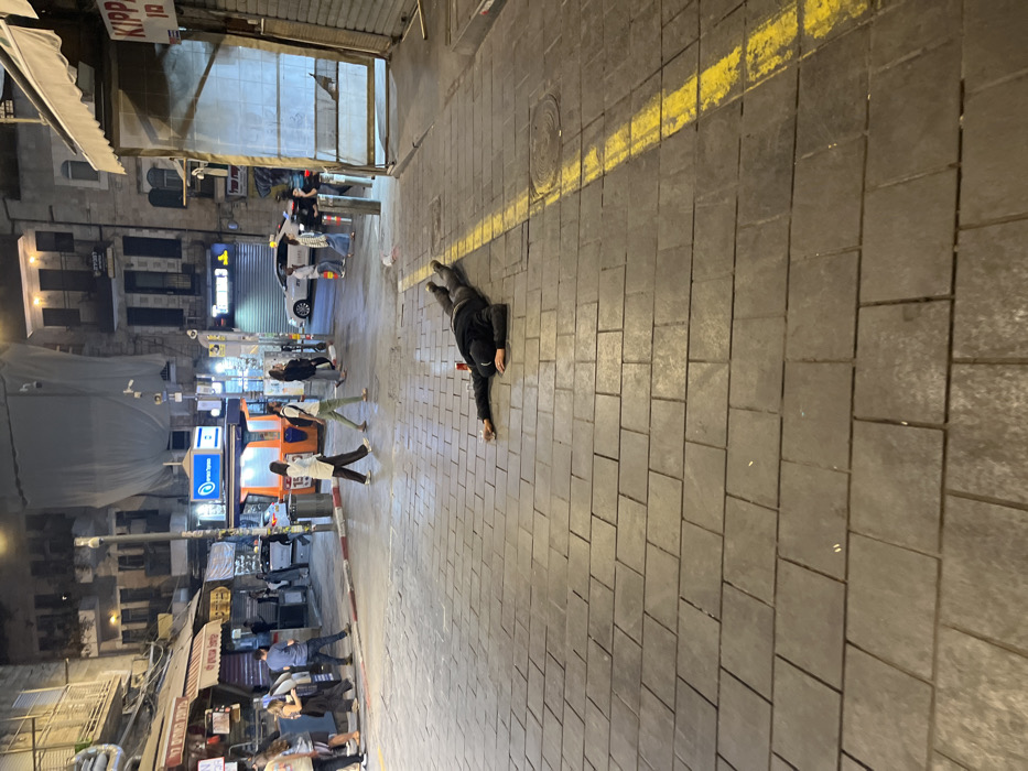 The image depicts a nighttime urban scene on a paved commercial street in Jerusalem, Israel, characterized by multi-story stone buildings and Hebrew signage. In the foreground, an individual dressed in dark clothing, possibly a black hoodie and dark pants, lies prone on their stomach on the dark grey rectangular-paved sidewalk, with arms extended outwards and legs slightly splayed. A red and white beverage can is positioned near their head on the pavement, which also features a prominent, faded yellow painted line running diagonally across the right side, intersecting a circular manhole cover. In the midground, approximately a dozen pedestrians are visible walking on an adjacent street or sidewalk, while vehicles, including a white taxi, are present further in the background. Shopfronts with awnings and rolled-down shutters, an illuminated kiosk displaying an Israeli flag, and various streetlights contribute to the urban environment.