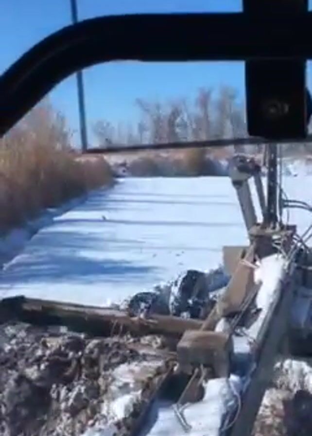 view from inside a vehicle with a long piece of machinery attached to the front, traveling across a snow-covered field. The sky is clear and blue, with some trees and reeds visible in the distance. The machinery in front appears to be digging or clearing the ground, moving through dirt and snow. The cabin of the vehicle has various controls and windows. There is audio of music playing in the background.
