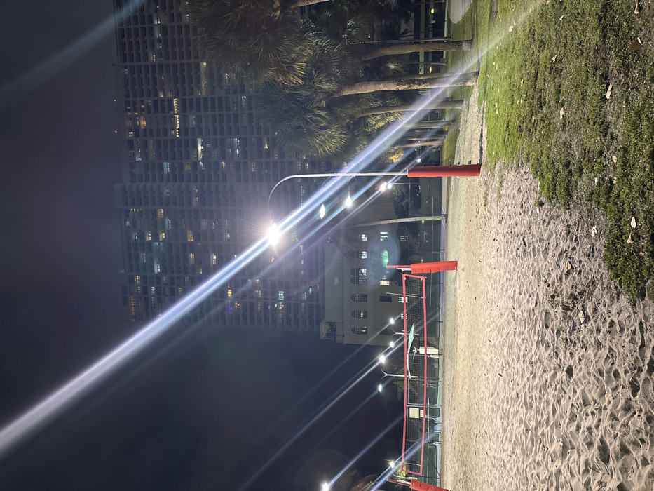 The scene depicts a nighttime view of a beach volleyball court located in Miami, United States of America. In the foreground, a sandy court is visible, equipped with a red net and padded red support poles. The sand shows various undulations and impressions. To the right of the court, a distinct boundary separates the sand from a strip of green grass, where some scattered debris or leaves are present. Overhead, a prominent streetlamp with a curved arm and multiple LED panels illuminates the court and surrounding area, producing significant lens flares that streak diagonally across the image. In the midground, beyond the volleyball court, additional court markings or a second net post are discernible. A line of tall palm trees with slender trunks borders a paved pathway or grassy area to the right. Behind the court and slightly to the left, a light-colored, multi-story building with a more classical architectural style, featuring arched windows, stands partially illuminated. The background is dominated by a towering, multi-story residential building, likely an apartment or condominium complex, characterized by numerous balconies and windows, many of which are illuminated, indicating occupancy. The sky above is dark, with a slight atmospheric glow near the brightest light sources. No individuals are visible on the court or within the immediate environment, and no specific actions or interactions are taking place.