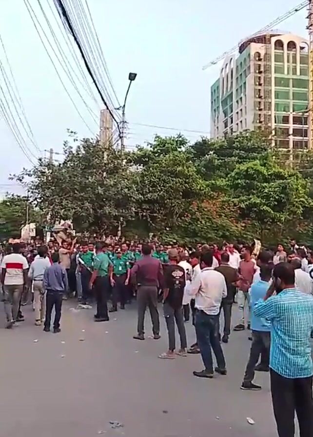 group of people standing in the middle of a road. Some appear to be uniformed officers or security personnel, while others are in civilian clothes. They are clustered together, some looking towards the center of the group. In the background, there are trees and a tall building under construction with a crane visible. Overhead, there is a network of power lines. The street is littered with some debris. The overall atmosphere appears tense.