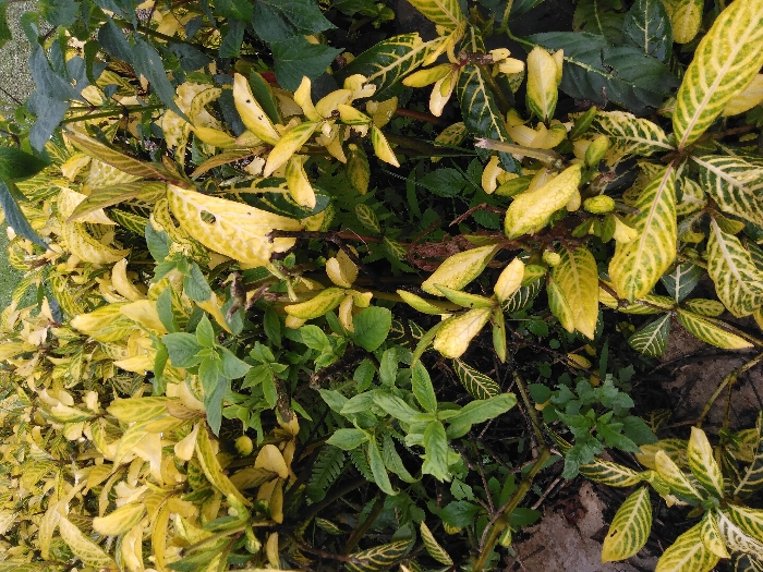 The image depicts a dense patch of mixed foliage located in the city of Chan-Nua, Laos. The primary subjects are numerous ornamental plants characterized by variegated leaves, predominantly yellow-green with darker green veining, or solid yellow. Several leaves exhibit visible damage, including holes and tears. Interspersed among these are plants with solid green leaves, appearing as smaller shrubs or ground cover. Brown and reddish-brown stems are visible throughout the dense growth. The ground, partially obscured by the foliage, appears as dark soil. No people, animals, or man-made objects are discernible, and no explicit actions or interactions are taking place. The scene is illuminated by natural daylight.