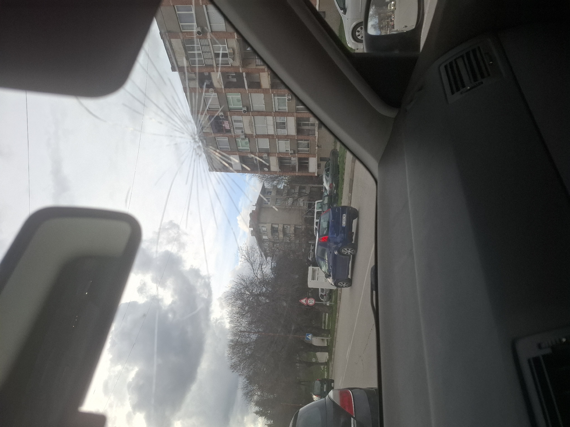 The image depicts a daytime urban street scene captured from inside a vehicle, looking through a front windshield with a prominent radial impact crack originating in the upper-right quadrant. The vehicle's dark-colored dashboard and the lower portion of its rearview mirror are visible in the foreground. The external scene is identified as a street in Veliko Tarnovo, Bulgaria, based on the "BT" prefix of the Bulgarian license plate "BT 5287 ME" visible on a blue Fiat Grande Punto hatchback in the mid-ground. The sky is overcast with patches of brighter light. On the left side of the image, the rear of a dark-colored hatchback vehicle is visible, apparently stationary in traffic. Further down the street on the left, bare deciduous trees line the sidewalk, alongside a '30 km/h' speed limit sign and a pedestrian crossing sign. To the right, a multi-story residential apartment building with concrete and brick facades, numerous white-framed windows (many with external roller shutters), balconies with metal railings, and several visible exterior air conditioning units, dominates the background. Clothes are visible hanging to dry on some balconies. Another similar apartment building is partially visible further down the street on the left. Several other vehicles are parked along the street. Overhead, power lines are visible against the sky. No individuals are clearly discernible.