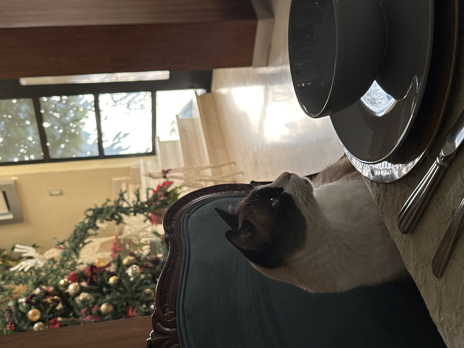 - "A Siamese cat rests on a blue velvet chair, nestled between a place setting and the chair's armrest" by FM-VC7Bi1, licensed under CC BY 4.0