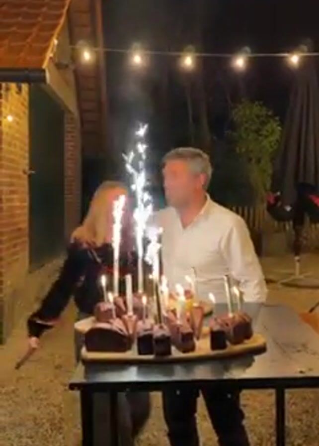 A man and a woman are celebrating a birthday outside at night. The woman, with blonde hair, is on the left in a floral print top and dark pants. She initially holds something blue in her hands, possibly a gift. The man is on the right wearing a light button-down shirt and dark pants. They stand beside a black table laden with pieces of chocolate cake. Each cake piece has a candle lit on top, and some also have sparklers going off. Behind them, strung overhead, are strings of lights. The scene is lit by these lights, candles, and sparklers. To their left, a brick building with a red-tiled roof and a dark green door can be seen. An open umbrella is behind the man, to his right. The man has his arm around the woman’s shoulder and kisses her head.