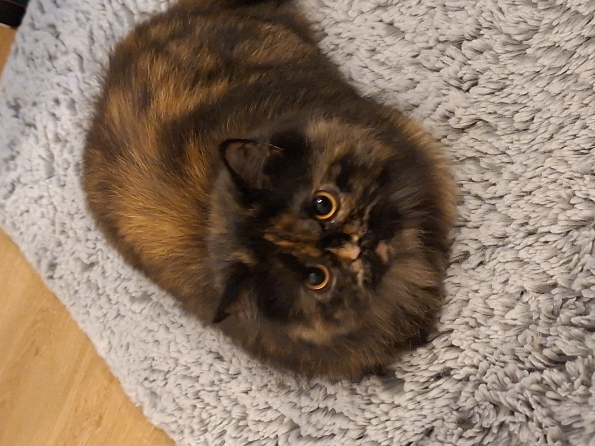 A single domestic cat is depicted lying on a light grey, shaggy textile surface in an indoor environment in Gabrovo, Bulgaria. The cat is long-haired, with a tortoiseshell coat pattern comprising shades of dark brown, black, and orange. Its body is compacted into a rounded form, with its limbs not visible. The cat's face is oriented towards the viewer, featuring prominent, round, amber-colored eyes and a small pink nose with a dark fur pattern below it. A light-toned wooden floor is partially visible at the upper left and right edges of the frame, bordering the textile surface. No human subjects or other animals are present. The cat is in a resting posture.