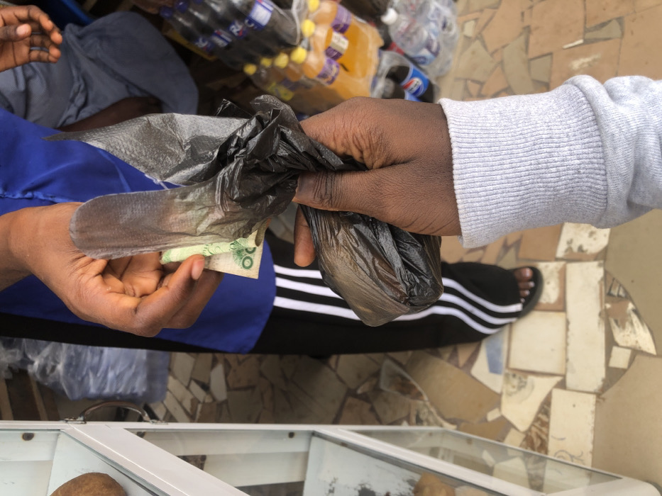 The image depicts a close-up view of a transaction occurring at a street vendor stall or small shop in Egan, Nigeria