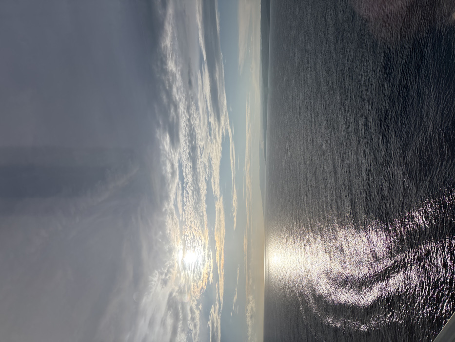 The image displays an elevated maritime view located off the coast of Unknown, Jamaica. The frame is horizontally bisected by the horizon. The upper half features a partially cloudy sky, with the sun situated in the upper-left quadrant, emitting a bright, diffused glow. Clouds vary from scattered wisps to broader, stratiform layers, appearing brighter near the sun and darker grey-blue elsewhere. The lower half of the image depicts the surface of the ocean, which is a deep blue-grey with visible ripples. A distinct, shimmering path of direct sunlight reflection extends from the horizon to the lower-left portion of the water. Along the right half of the horizon, a low-lying, hazy landmass or coastline is faintly visible in the distance. No individuals are present. A small, indistinct white structure is partially visible in the extreme lower-left foreground, likely a component of the vantage point.