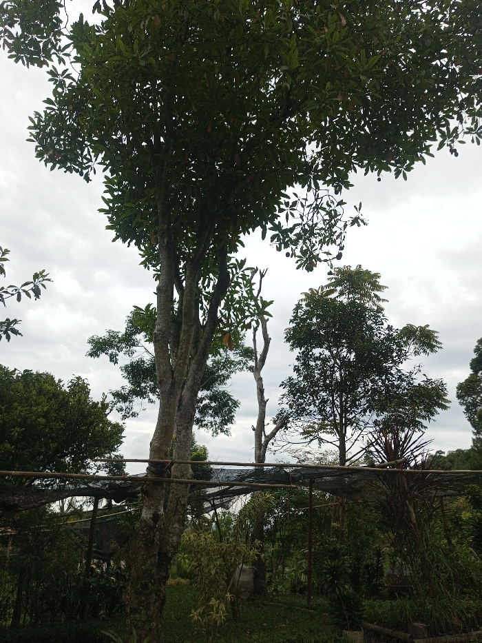 The scene depicts an outdoor vegetated area in Hasanparthy mandal, India, under an overcast sky with light grey clouds. A large tree with multiple sturdy trunks and dense dark green foliage occupies the left side of the frame, extending upwards. Several dark, oval-shaped fruits are visible hanging from its branches. To the right of this tree, a lighter green tree stands, along with a bare, pruned tree trunk. A man-made structure, comprising horizontal bamboo poles supporting dark netting, runs across the mid-ground. Below and around this structure, various smaller green plants, shrubs, and grasses cover the ground. No individuals or animals are present.