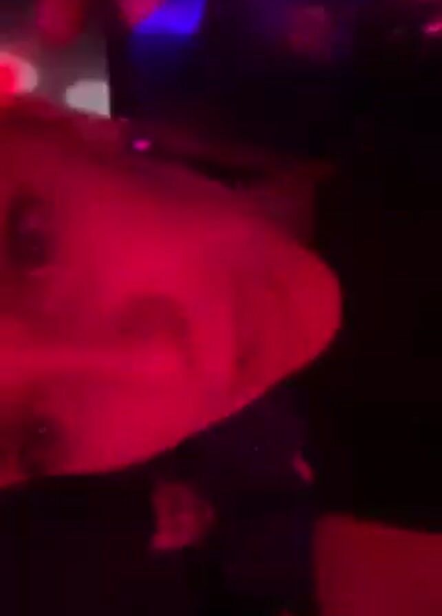 A person, likely female, is holding a bottle of what appears to be alcohol in front of their face. The lighting in the room is dark and primarily red, creating a nightclub atmosphere. The person seems to be filming themselves, as they are looking directly at the camera and moving it slightly. There are flashing lights in the background, suggesting a party or club setting with music. The person's face is partially obscured by the bottle, but their lips and some facial features are visible. The bottle is dark, and its label is not easily discernible due to the lighting.