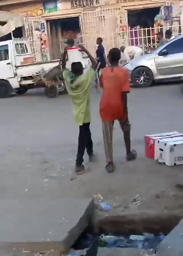 Two young boys walk along a city street in an impoverished area. One boy carries a white bucket on his head, while the other walks beside him. There are many pieces of trash scattered about the street. There are various shops and vehicles along the street. The first boy wears a lime green shirt and black pants, while the second boy wears an orange shirt and tan plaid pants. The first boy steps up onto a stack of cardboard boxes.