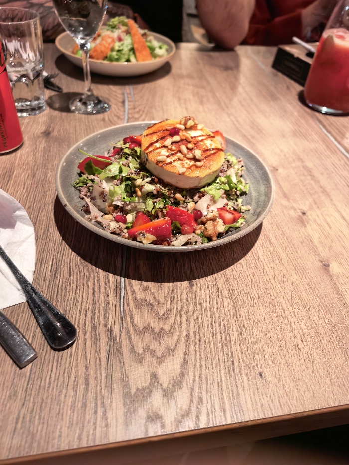 The image displays a dining scene inside a restaurant in Plovdiv, Bulgaria, focused on a plate of food positioned on a light brown wooden table. The central subject is a round, grey ceramic plate containing a salad. This salad features mixed green leaves, red quinoa, diced red strawberries, pomegranate seeds, and visible walnut fragments, all drizzled with a dark glaze. Centered on the salad is a grilled round of goat cheese, topped with pine nuts and additional walnut pieces, exhibiting distinct grill marks. To the immediate left of the main plate, a dark metallic fork and a partially visible knife rest on a crumpled white napkin. Further left, a red beverage can with white Cyrillic text ("РЕШИКЛМ") and a clear glass are partially visible. In the blurred background, another light-colored bowl holds a green salad with elongated orange elements. A stemmed glass (wine glass) is visible behind the main plate. To the right, a tall clear glass containing a red beverage with a straw is present. Portions of two individuals are discernible in the background: one arm wearing a dark sleeve on the left, and a shoulder/arm in a red top on the right, indicating their presence at the table. The table surface exhibits a distinct wood grain pattern.