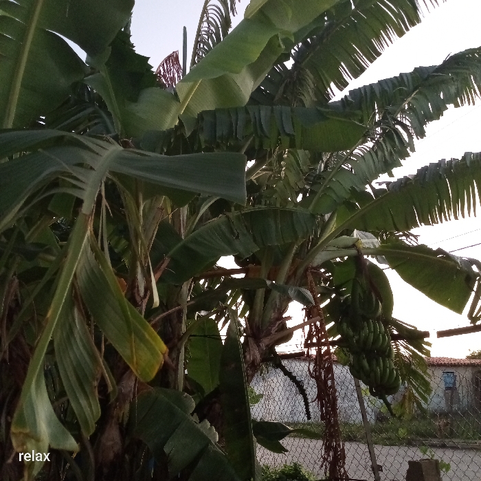 A lush banana plant dominates the frame, its broad green leaves filling the scene. A bunch of unripe green bananas hangs prominently, illuminated by a diffuse light. In the background, a chain-link fence and a glimpse of a building suggest an urban setting. The overall impression is one of vibrant greenery amidst a constructed environment. The word "relax" appears in the lower left corner of the image.