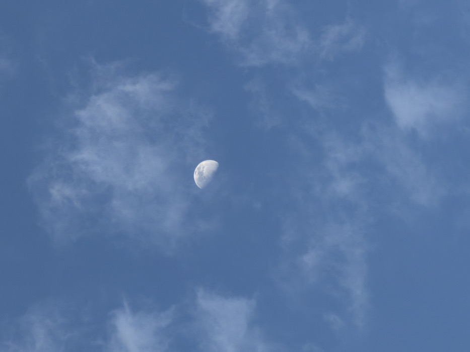 A daytime sky, filled with wispy, white clouds against a blue backdrop, features a partially visible moon. The moon, a crescent shape, appears roughly halfway full, with its illuminated portion facing left. The clouds surround the moon, adding depth and texture to the serene skyscape.
