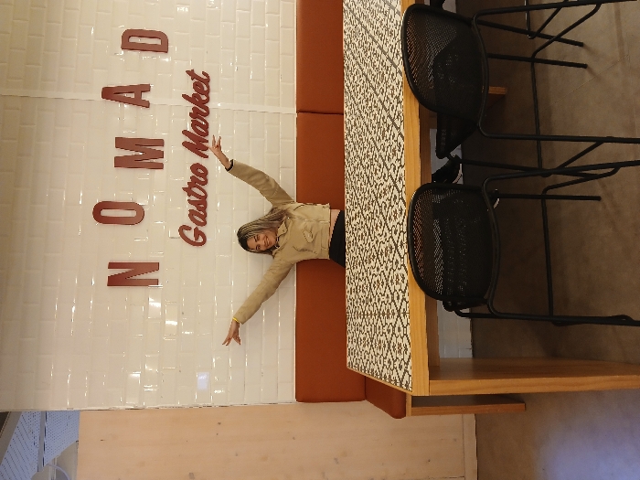 A smiling woman stands next to a wall that reads "NOMAD Gastro Market." She wears a tan jacket and black pants, with her arms outstretched. Beside her is a long table with a patterned top and light wood edges. Two black chairs are placed at the table, with their backs visible. The wall is white and appears to be tiled in a rectangular pattern.