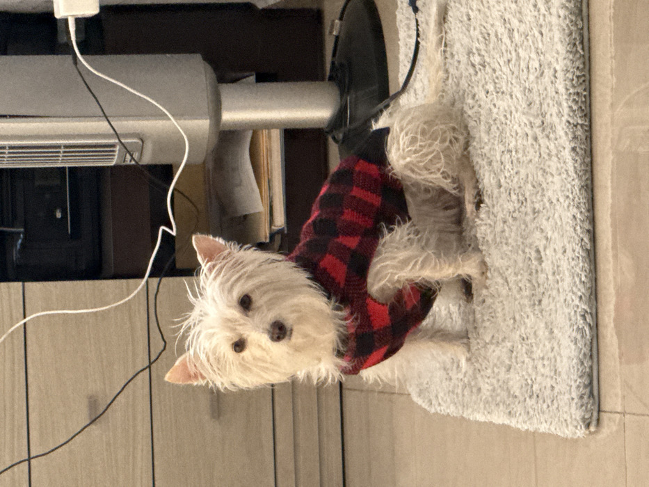 - "A white, small dog with a red and black plaid sweater sits partially on a light gray, fluffy mat" by FM-uvcyJ3, licensed under CC BY 4.0