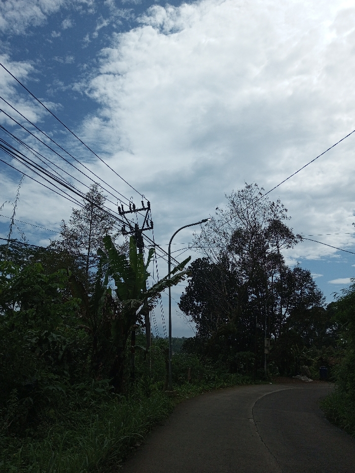 The image presents a daytime scene in Ariyalai, Sri Lanka, depicting a paved asphalt road that curves gently to the right and recedes into the distance. Dense green vegetation, comprising a variety of trees, shrubs, and grassy areas, borders both sides of the road. A prominent banana plant with large leaves is visible on the left side. The sky above is partially blue with scattered white cumulus clouds. On the left side of the road, a dark utility pole supports multiple cross-arms from which numerous dark electrical wires extend horizontally across the upper-left quadrant of the frame. Adjacent to this pole, a grey metal streetlight pole with a curved arm and an LED-style luminaire stands positioned to illuminate the road. Additional wires stretch horizontally across the upper right portion of the image. No individuals or animals are present. Towards the far right, at the bend of the road, a dark object resembling a waste bin or container is partially visible amidst the foliage, with lighter-colored debris or materials nearby. The scene is static, illuminated by natural daylight.