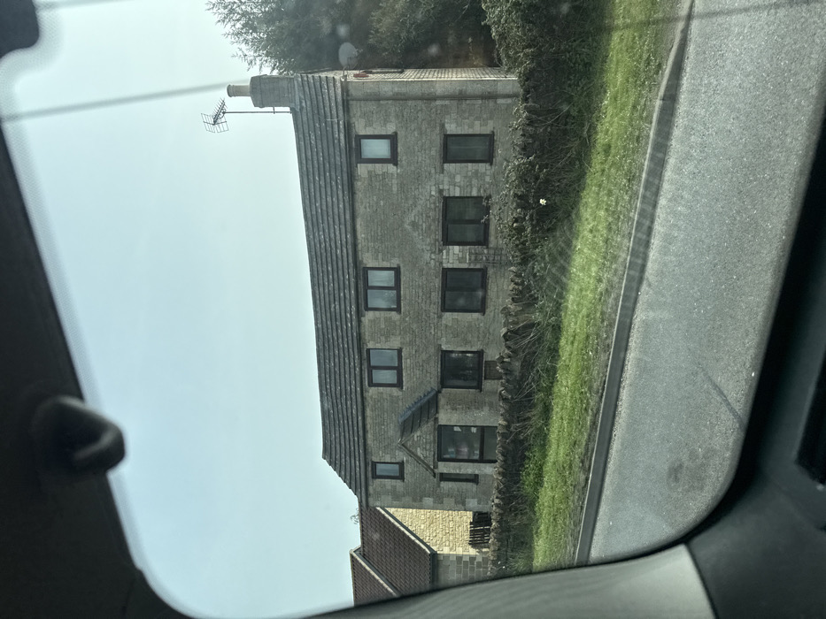 The image depicts a two-story, light-colored stone house situated in Thorpe Waterville, United Kingdom, viewed from inside a vehicle through a side window