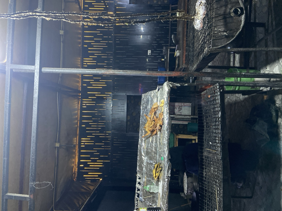 dimly lit outdoor cooking area, likely a street food stall, located in Dodoma, Tanzania, at the coordinates -6.157 latitude and 35.723 longitude. There are two large metal grills, one on top of the other, both with a layer of charcoal embers and ash. One grill is topped with a sheet of aluminum foil, holding cooked chicken and possibly bananas. A third, larger, cylindrical grill sits on the right, also with charcoal embers, and a piece of meat is visible on the grill itself. The scene is messy, with evidence of cooking and food preparation. There are also several unidentified black objects in the scene, potentially containers for cooking ingredients or tools. The walls of the cooking area are black with a patterned design and covered by a canopy. The floor is a rough, uneven surface. There are no people present in the image.