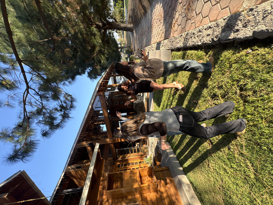 Three women stand in a grassy area next to a wooden structure with a reflective, glass-like A-frame roof