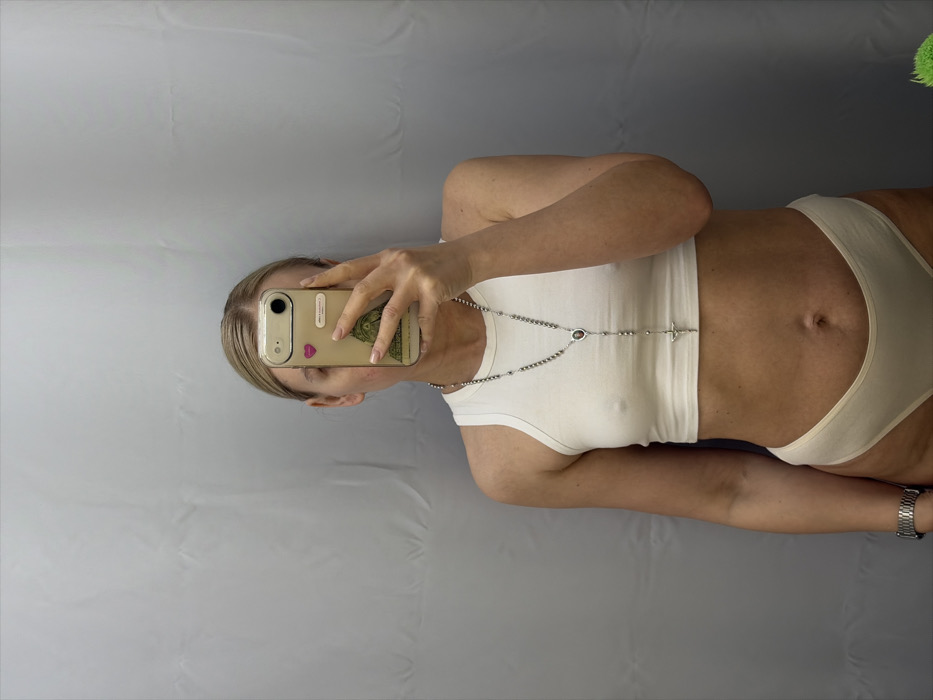 The image depicts a woman taking a mirror selfie in Chaikovsky, Russia. The woman, with blonde hair pulled back, is partially visible, with her face obscured by the light-colored smartphone she holds in her right hand. She is wearing a white sleeveless crop top, revealing her midriff, and light-colored underwear. A long silver-toned rosary with a crucifix and a central medallion hangs around her neck. A silver-colored wristwatch is visible on her left wrist. The smartphone is housed in a clear case, which features a small pink heart sticker and a larger sticker depicting a domed architectural structure. The background consists of a plain, light grey fabric, possibly a curtain or divider, exhibiting subtle vertical folds. The scene is evenly lit.