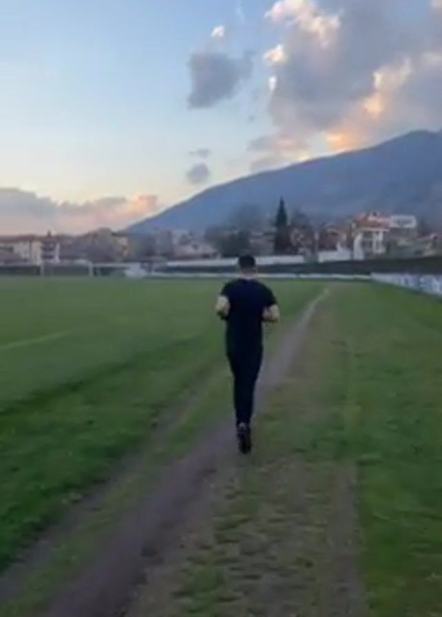 man running on a grassy path next to a soccer field towards the camera. The man is wearing a black shirt and black pants. He is running away from the camera. To the left of the path is a soccer field with white lines. To the right of the path is a white fence. Beyond the soccer field are buildings and mountains. The sky is cloudy, and the sun is setting behind the clouds. The video is taken from a low angle.