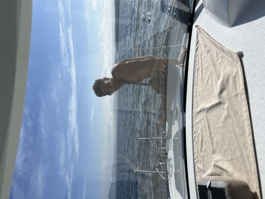 This image depicts a daytime scene from the interior of a white powerboat, positioned offshore near the city of M'diq, Morocco, likely in the vicinity of its coastline or marina entrance. A male individual, appearing to be in his twenties or thirties, is seated shirtless on the forward deck of the boat, facing towards the viewer and slightly to the right. He wears sunglasses, has short dark curly hair, and exhibits a faint smile. His bare legs are extended towards the left side of the frame, and his right hand rests on the boat's white structure or rail. The foreground, viewed through a clear windshield, features a beige fabric cover draped over an internal console or dashboard. Beyond the windshield, the boat's white deck and stainless steel bow rails are visible. The surrounding environment consists of open blue water with moderate surface chop. In the background, distant landmasses, appearing as hills or mountains, stretch across the horizon. A distinct linear structure, consistent with a breakwater or pier, is visible on the far right horizon. The sky above is clear blue with sparse, wispy white clouds.