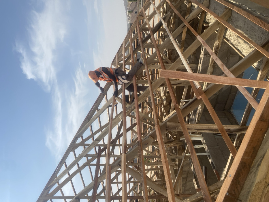 A male construction worker is observed on the roof framing of a building in the city of Rafin Bauna, Nigeria