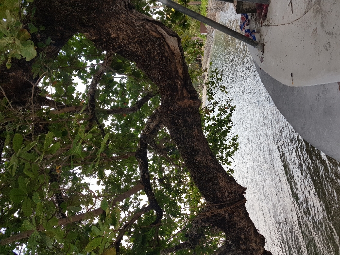 The image displays a coastal scene in Patong, Thailand. A large, mature tree occupies the left and upper portions of the frame, featuring a thick, gnarled trunk with dark, textured bark and extensive branches covered in dense green foliage. Some leaves are broad and ovate. A thick, brown, rope-like material is wrapped around a prominent branch extending over the water. Below the tree, a body of calm water with a rippled, light-reflecting surface stretches across the midground. The water meets a light-colored concrete walkway or retaining wall that curves gently from the lower left towards the right. On the right side of the walkway, a metallic pole or pipe extends vertically, leaning slightly, with its base embedded in the concrete. Adjacent to the pole's base are several bundled items, including distinct red, white, and blue fabric or plastic material, and a dark, block-like object. Scattered small debris is visible on the concrete surface. In the background, along the curving shoreline, additional green trees and vegetation are present, with obscured small structures partially visible. The overhead sky appears bright, indicating daylight. No individuals are depicted.