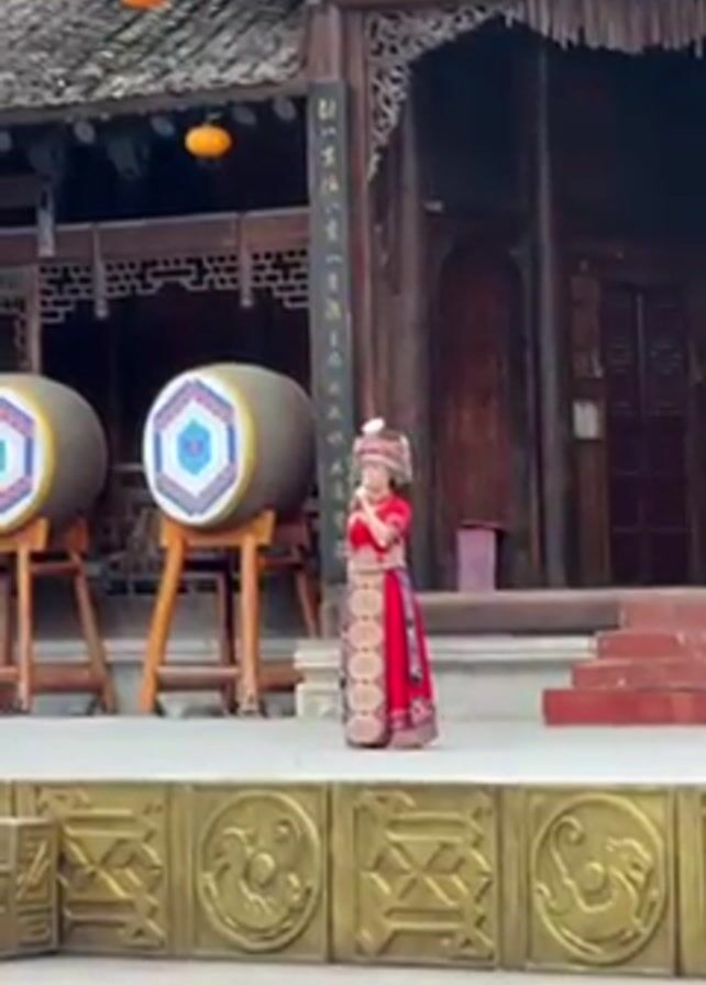 A woman in ethnic attire stands on an ornately decorated stage and sings into a microphone. She is wearing a red and patterned dress with a matching headdress. Behind her are two large drums with colorful geometric designs. The stage is in front of a wooden building with a traditional Chinese roof and windows. There are hanging lanterns and inscribed columns.