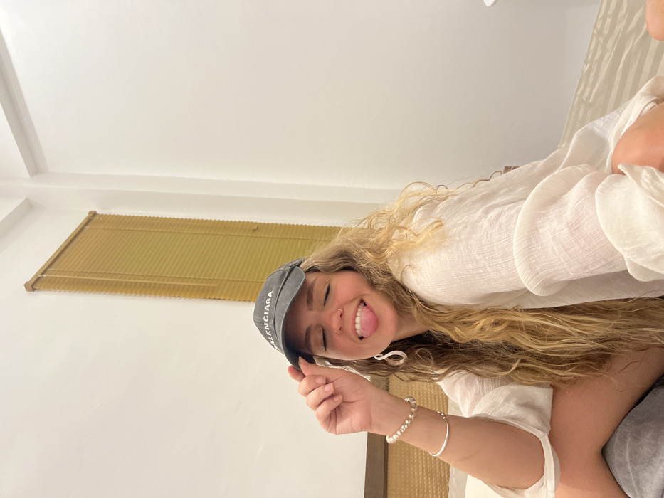 A young woman poses indoors wearing a gray "Balenciaga" baseball cap and a loose, white linen shirt. She sticks her tongue out playfully. Light brown, wavy hair cascades over her shoulder. She wears a silver bracelet on her wrist, along with a white beaded bracelet. A slatted blind hangs on the white wall behind her. The image is rotated, appearing slightly tilted.