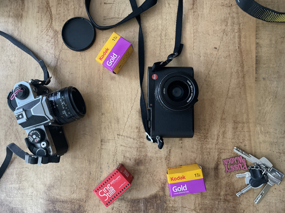 The image displays an overhead view of various items arranged on a light brown wooden surface, consistent with a tabletop. No individuals are present. In the upper-left quadrant, a silver and black Nikon film SLR camera, likely a Nikon FM or FE series, is oriented diagonally with its lens facing towards the lower-right. A black Nikkor 50mm lens is attached, and a black fabric strap extends from the camera body. A pink paperclip is visible hooked onto the camera's hot shoe. Below the Nikon camera and to its left, a red rectangular box of CineStill 800Tungsten film is positioned diagonally. In the central-right area, a black circular lens cap rests on the wooden surface. To the right of the Nikon camera, a yellow and purple box of Kodak Gold 1 36 EXP 200 Color Negative Film is placed. Centrally positioned below the Nikon camera, a black Leica compact digital camera is laid horizontally, facing towards the viewer. It features a Summilux 1:1.7/28 ASPH lens and has a black fabric strap attached, extending towards the upper-right and lower-right corners. In the lower-left quadrant, another yellow and purple box of Kodak Gold 1 36 EXP 200 Color Negative Film is present. Directly below the Leica camera, a cluster of metal keys on a keyring lies on the surface. A pink rectangular keychain, bearing the raised white text "PUSSY WAGON," is attached to the keyring. The wooden surface exhibits visible grain patterns and minor imperfections. The lighting is uniform. The image provides no visual information or contextual clues to determine its specific location within the city of Saint-Denis, France, or any other geographical area.