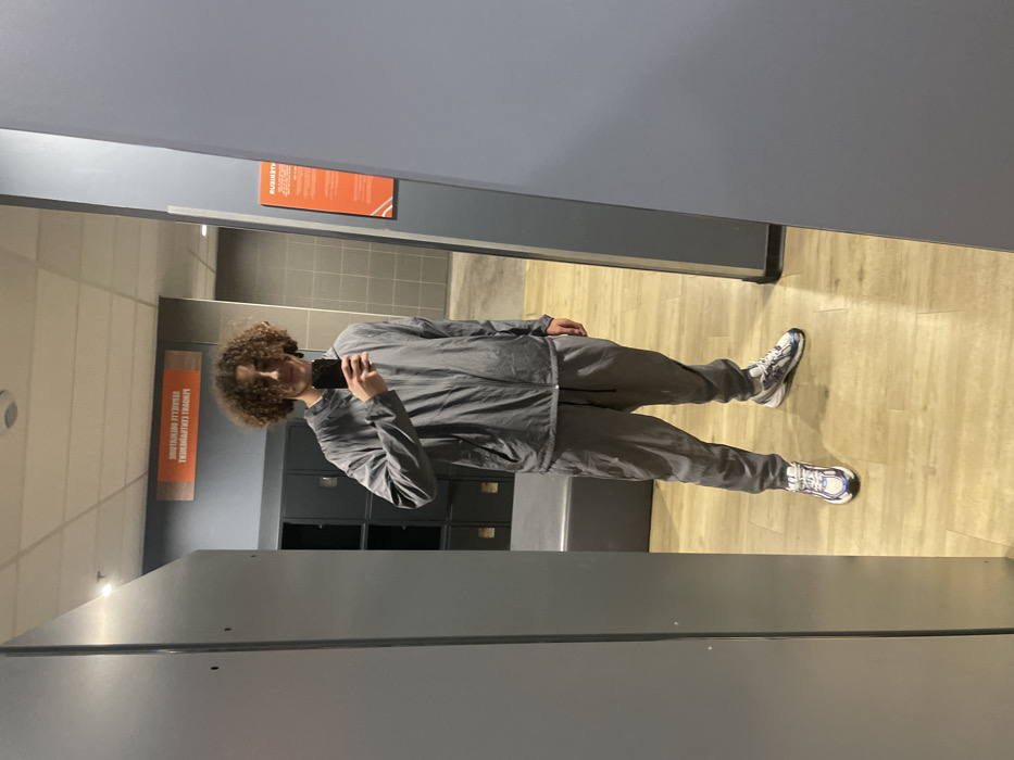 A young individual with curly dark hair, dressed in a gray hooded tracksuit and white, blue, and silver athletic sneakers, is depicted in a mirror selfie
