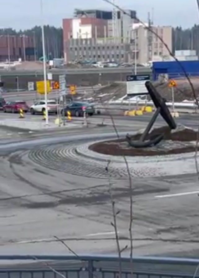 roundabout in a city with an anchor statue in the center. Cars are circulating the roundabout. In the background, there is a large building under construction with a crane. Bare tree branches are visible in the foreground. The sky is overcast.