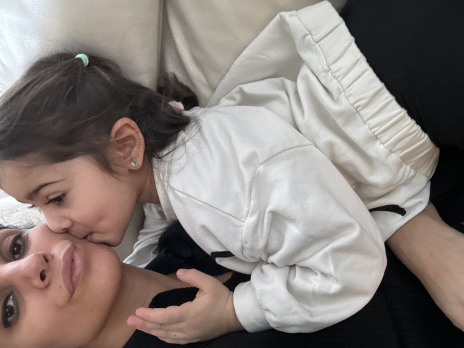 The image depicts two individuals in an indoor setting. An adult female, characterized by dark hair, eye makeup, and full lips, is positioned on the left, turning her face to the right with her left cheek slightly presented. A young child, likely female, with dark hair tied back with a light green hair tie on the right side and a pink hair tie on the left, is seen on the right, pressing her face against the adult's left cheek, consistent with an embrace or kiss. The child wears light-colored (possibly white or off-white) long-sleeved top with elasticated cuffs and a visible dark stripe detail on the left side, along with dark trousers. She has small, star-shaped stud earrings in both ears. The child's left hand is raised, positioned near the adult's neck and shoulder. The adult wears a dark-colored garment with a collar. Both individuals are positioned against a light-colored, upholstered surface, consistent with a sofa or armchair. There are no visual elements within the image to confirm the specific location as the city of Mishutkino, Russia.