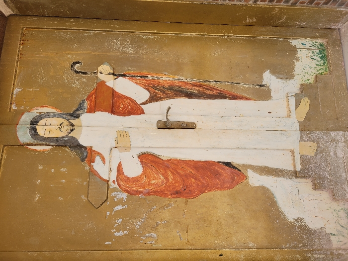 This image depicts a weathered golden-brown double wooden door, likely an exterior entrance, located in Ebenebe, Nigeria. The door features a full-body, hand-painted depiction of Jesus Christ as the Good Shepherd. Jesus is centrally positioned, with dark hair, a beard, and a faint halo. He wears a long white robe and a red cloak draped over his shoulders. His left hand rests on his chest, and his right hand holds a dark, curved shepherd's crook. His bare feet are visible, positioned on painted steps. A white lamb is partially visible to the left of Jesus, also on the painted steps. Green grass is painted at the lower right base of the door. A metallic, tarnished door handle and latch mechanism are centrally located, bisecting the painted figure of Jesus. The door surface exhibits significant paint loss, chipping, and discoloration, particularly on the left panel and around the door handle. A red-brown brick wall is visible on the far right edge of the frame.