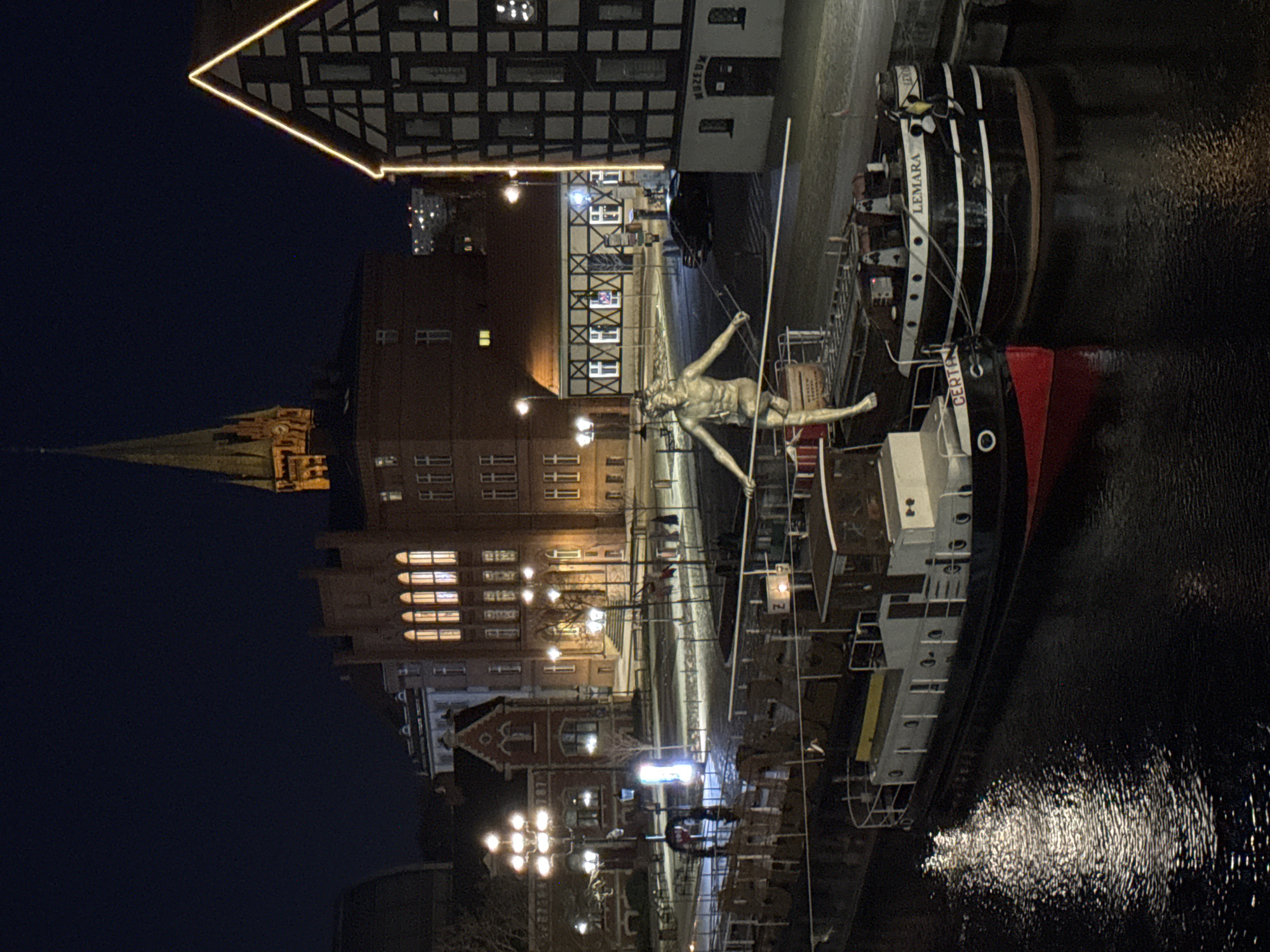 At night, the image shows a view of Bydgoszcz, Poland. In the center, a statue of a nude male figure is positioned on a boat. The boat is docked alongside a river, with historic buildings illuminated in the background. To the left, a tall church spire rises above the buildings. The water reflects the city lights, creating a mirrored effect. The sky is dark. There are no people clearly visible.