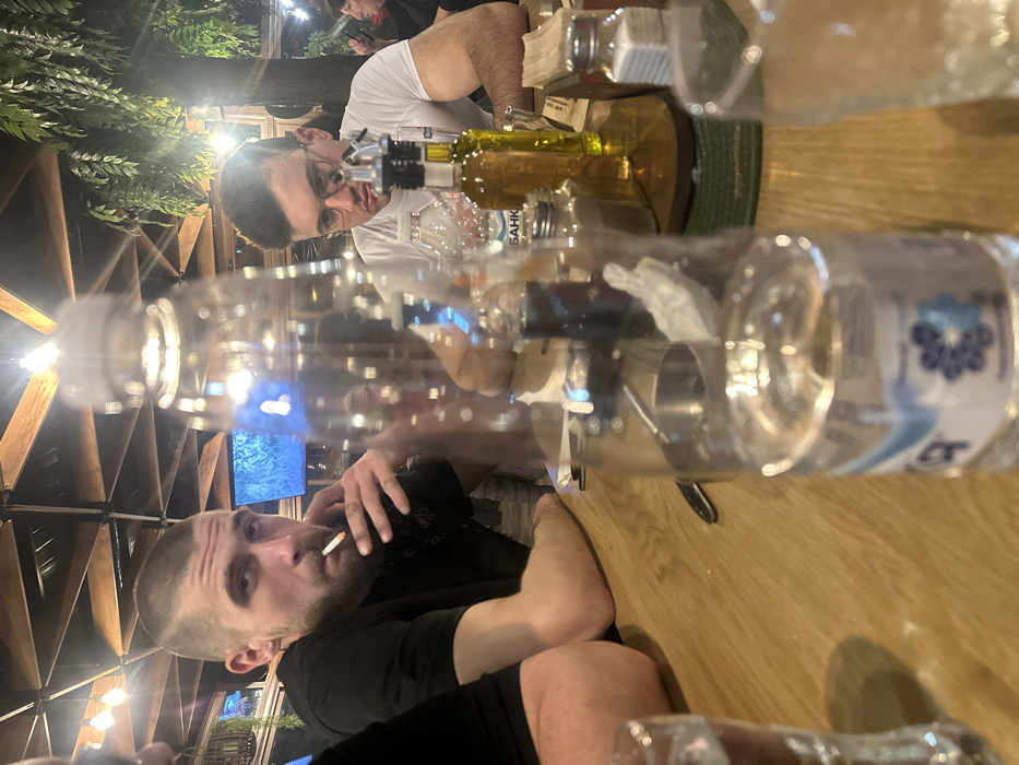 The image displays a nighttime scene within a restaurant or cafe setting in Stara Zagora, Bulgaria. Three male individuals are seated at a light-colored wooden table. In the immediate foreground, a clear plastic water bottle, partially filled with water and featuring a blue and white label, is out of focus. To the left of the bottle, a man with a short buzz cut and facial hair, dressed in a black short-sleeved shirt, is visible from the chest up. He holds a lit cigarette between the fingers of his right hand, positioning it near his mouth, and looks directly forward. His left forearm rests on the table. Partially visible to his left is the bare arm and shoulder of another individual. To the right of the foreground bottle, another man with short dark hair and eyeglasses, wearing a white short-sleeved shirt, is seated. His forearms rest on the table, and he looks downwards or straight ahead. Arranged on the table, behind the foreground bottle, are several objects: a dark-handled knife, a small circular dark green coaster, a condiment caddy holding two clear bottles with silver spouts (one containing a yellow liquid, the other a dark liquid), and at least two silver-capped shakers. A stack of white napkins is also visible in a small wooden holder. The background shows a ceiling composed of light-colored beams or a lattice structure, from which multiple light fixtures emit a warm glow. Dark green foliage is visible on the right side of the background, and a rectangular screen displaying a bright blue image is present in the center-background. Blurred figures of other patrons are faintly discernible in the distance. The overall lighting is dim, characteristic of an evening environment.