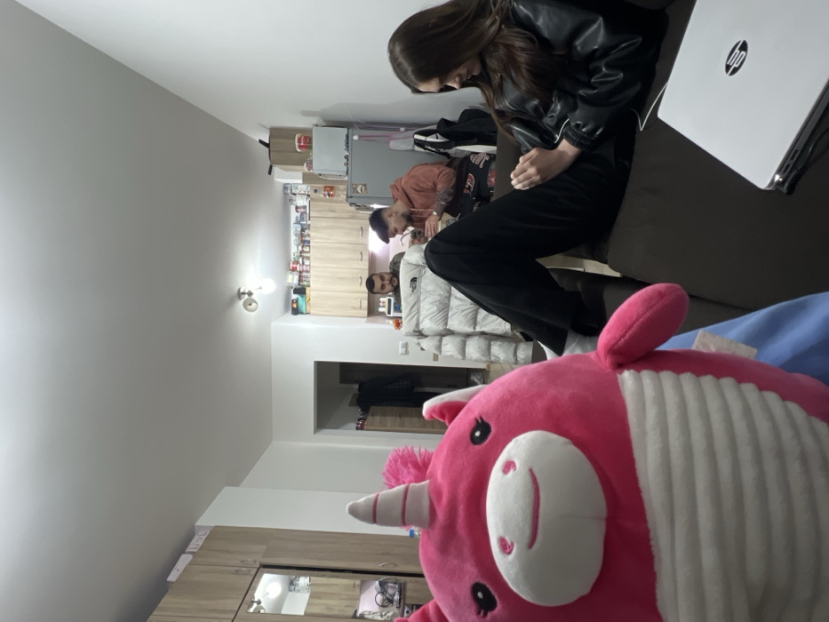 The image portrays an indoor domestic scene located in Sofia, Bulgaria. In the immediate foreground, a large, pink plush unicorn toy with a white ribbed belly, a pink horn, and stitched black eyes and mouth is positioned, facing the viewer. To the right, a young female with long dark hair is seated on a dark brown sofa, her legs extended. She wears a black leather jacket and black trousers, holding a mobile phone with both hands and looking down at its screen. A silver HP laptop with its lid closed rests on a dark surface in front of the sofa. In the midground, to the left, a light wood wardrobe with a mirrored door is visible. Further back, in what appears to be a combined living and kitchen area, three males are present. One bearded male, wearing a dark top, stands partially obscured by a white puffer jacket draped over a furniture item, facing towards the right. Another male, with short dark hair and wearing a reddish-brown hoodie, is seated or leaning, looking down at an item in his hands. A third male is partially visible behind the bearded individual. The background features light wooden kitchen cabinets with various items stored on top, a white refrigerator, and white walls illuminated by a single ceiling light fixture.