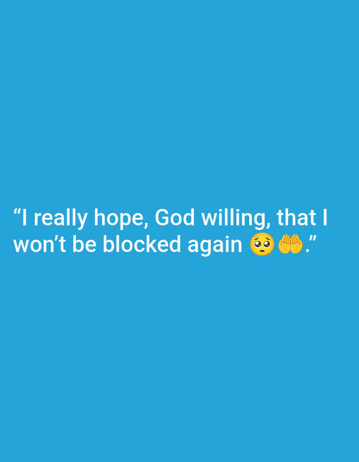 The image is a light blue background with the text "I really hope, God willing, that I won't be blocked again" in white