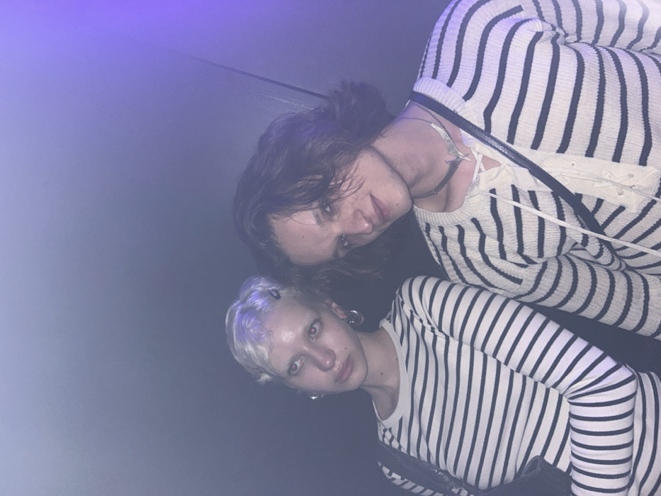 Two women are in the frame, one with short, platinum blonde hair and hoop earrings, and another with long, dark hair. Both are wearing striped sweaters. The image is somewhat dark and has a blueish cast. The photo is slightly tilted, and the women appear to be posing close together.