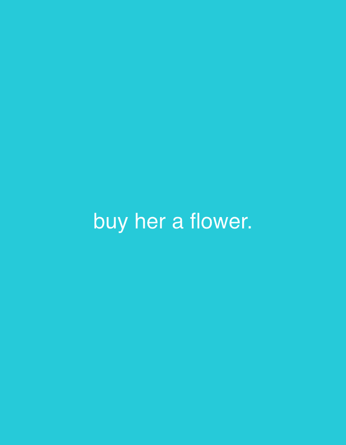 The image displays a uniform, solid cyan-blue background, acting as the sole environmental feature. White, sans-serif text, rendered entirely in lowercase, is centered horizontally and slightly below the vertical midpoint of the frame. The text reads: "buy her a flower." No individuals, physical objects beyond the text, or specific actions are depicted. No discernible interactions are present. The only subject is the text itself. The scene is attributed to the city of Pernik, Bulgaria, as per contextual information provided for this description.