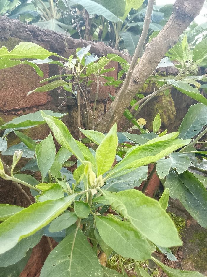 This image depicts a close-up view of dense green foliage, likely a shrub or small tree, growing in an outdoor environment within the city of Unknown, Unknown. The foreground features numerous large, ovate green leaves, with some exhibiting lighter green coloration indicative of new growth. Small, pale green floral buds are visible on some stems among the leaves. In the midground, a substantial, textured woody branch, light brown in color, extends diagonally from the lower right towards the upper left. Behind the immediate vegetation, a weathered brick wall constructed of reddish-brown bricks is partially visible, showing signs of dirt and possibly moss accumulation. Further in the background, out-of-focus large green leaves consistent with banana plants are present. No individuals or animals are visible, and no specific actions are occurring. The lighting suggests natural daylight.