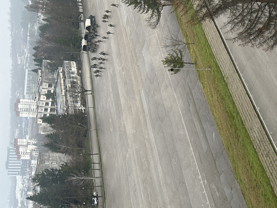 The image presents an elevated, wide view of a large, grey asphalt parade ground located at the Vasil Levski National Military University in Veliko Tarnovo, Bulgaria, under an overcast sky. Approximately 30-40 individuals, dressed in military fatigues, are observed walking in a dispersed formation across the paved area. To the right of these individuals, four olive-drab military cargo trucks, each with a canvas cover, are parked stationary on the far side of the parade ground. In the mid-to-far background, several multi-story buildings, exhibiting architectural characteristics consistent with post-socialist design, are visible amidst numerous trees. Some trees are deciduous with bare branches, while others are coniferous evergreens. A paved road runs along the left periphery of the parade ground, where a single white sedan is parked. The immediate foreground features a grassy embankment, sloping down from the viewer's perspective, with a single street light pole positioned within it. The overall environment suggests a military campus setting during daytime, likely in a colder season due to the bare trees.