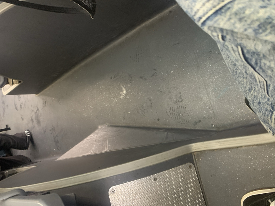 The image captures a low-angle view within the interior of a public transit vehicle, such as a tram or bus, operating in Strasbourg, France. The perspective is from a passenger looking downward and slightly forward. In the immediate foreground, to the right, are the upper thighs and lap of an individual wearing light blue, faded denim jeans. A segment of a dark, textured strap, possibly from a bag, is visible near the upper right edge. To the immediate left, the toe of a dark shoe with a distinct white sole rests on a grey, diamond-plate metallic floor section, secured by a visible screw in the upper left. The central area of the image features a narrow, dark grey aisle or passageway. The floor displays visible scuff marks, accumulated dirt, and multiple clear shoe prints. A small, white, irregular fibrous object or feather is discernible on the floor towards the center-right. This passageway is bordered on the left by a light grey vertical panel, forming part of a seating structure with a darker grey base, and on the right by a darker grey, solid panel, likely the lower section of an opposing seat. In the background, partially obscured by the seat on the left, are the lower legs and feet of another individual. One visible foot is encased in a dark shoe featuring three prominent parallel white stripes, consistent with Adidas branding. The environment appears functional and utilitarian, typical of public transportation.