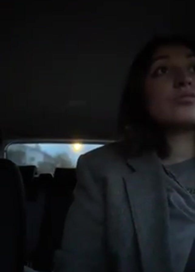A young woman is seated in the back of a car. She wears a gray blazer and a gray t-shirt with a necklace. She has short, dark hair and is looking slightly upwards. The car interior is dark. A banana is held to her mouth, and she takes a bite from it. A blurry view of a street is visible through the back window.